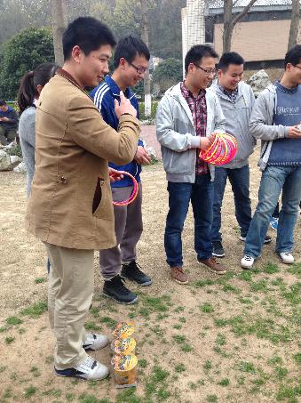 活动方在国防园的草坪上摆放奖品(如水果、饮料、零食、小盆栽、小生活用品等),活动参与者站在事先划定好的范围外,抛掷塑料圈以套中奖品,塑料圈压中奖品的面积大于一半的,可以领取该奖品。