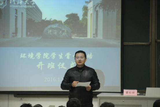 主持人宣布仪式开始后,曹书记上台为大家进行动员。首先,曹书记对环境学院2016级学生开学以来所取得的成绩做出了肯定,对同学们在运动会和河海足球杯等活动中取得的成果进行了表扬。