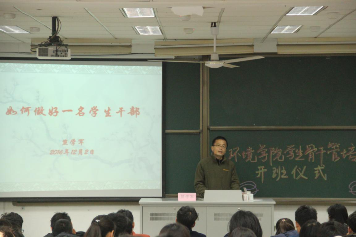本次开班仪式的主讲人是威尼斯国际2299cc党委书记笪学军,此外出席本次活动的还有环境学院党委副书记曹松祥,2014级辅导员老师曾莉、2015级辅导员老师王剑以及2016级辅导员老师金意倩。参加管培活动的有2016级年级委员、各班班级委员以及院三大组织的干事们,共160名学生骨干。