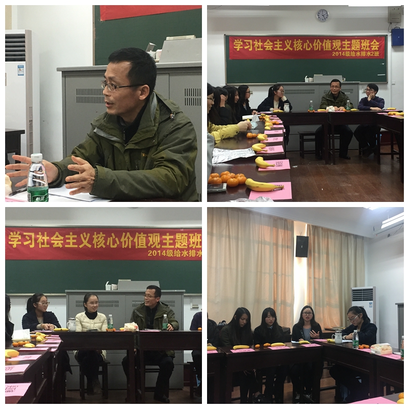 在活动的尾声,曾莉老师也对给排水2班这个团体寄予了厚望。我们虽然不是年级里最好的班级,但我们争做后劲最强的班级!路漫漫其修远兮,吾将上下而求索!本次主题班会,给排水2班的同学们有幸与笪书记有了亲密接触的机会。思维的碰撞,激发出了智慧的火花。笪书记亲切的笑容,已刻在我们脑海中。同学们对于前程的迷茫,经过书记的点拨,倒也有拨开云雾见青天之感!践行社会主义核心价值观,即是内化于心,外化于行。我们只有做好学生的本职工作,才能深入贯彻社会主义核心价值观!