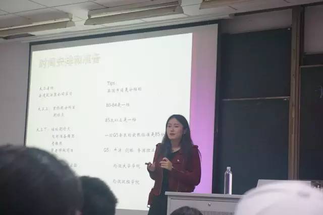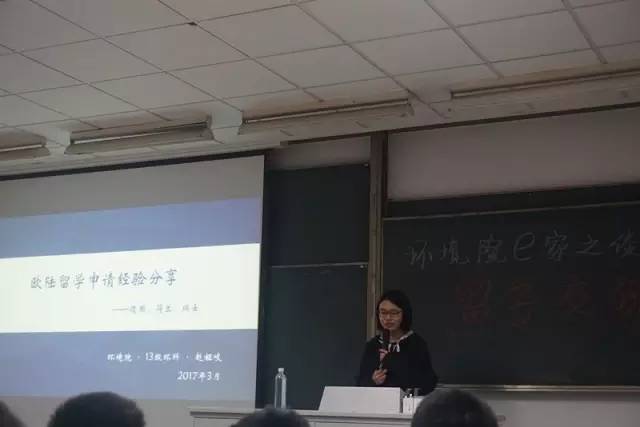 然后是来自13级环境科学中外合作专业的李铮同学为大家分享自己在留学方面的经验,李铮同学现已被英国帝国理工大学录取。李铮同学分享了自己留学准备的时间安排,并建议同学们尽早为出国留学做准备,在大三就可以着手向目标学校递交申请,同时注意提高成绩以达到目标学校的要求。李铮同学还就自己的面试经历提醒大家增加自己的实习工作经验,要注意对自己的大学及未来做好及时的规划。