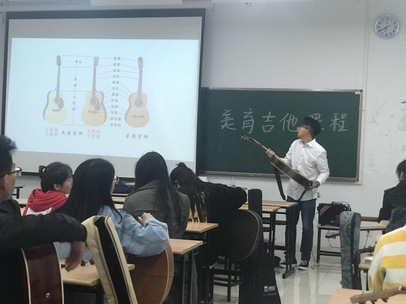 由于许多同学可能是第一次接触吉他,老师便从吉他的分类开始讲起,为了让一些新手能够买到适合自己的吉他,老师还特意介绍了吉他的品牌和一些选购吉他的小知识。同学们都在聚精会神地听着。接下来,老师开始介绍吉他的弹奏和指法,并给同学们做起示范,教室里响起一阵阵琴弦拨动的声音,同学们开始尝试弹奏,期间,老师又一个个地为同学纠正指法,防止同学们在学习中出错。