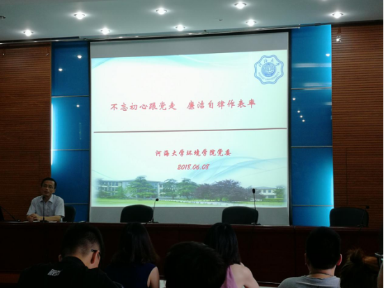2018年6月8日下午2点30分,威尼斯国际2299cc在校本部水利馆301召开2018届毕业生主题教育——“不忘初心跟党走,廉洁自律作表率”毕业生党员廉洁教育。由党委书记笪学军老师主讲,学院2018届毕业生党员参与了此次教育。