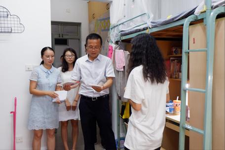 2018年9月1日,是新生报到的第二天。威尼斯国际2299cc党委书记笪学军、18级新生辅导员曾莉、助管计划辅导员李如斯深入18级新生宿舍,与新生及新生家长进行亲切交流并赠送文学书籍。