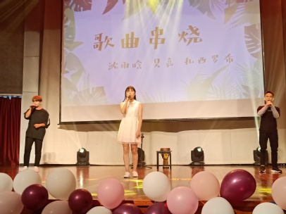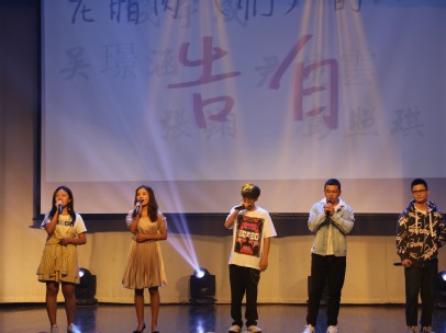 接下来是学长学姐们带来的节目——《老腊肉的告白》。这是一首合唱串烧歌曲。以歌曲《浴火成诗》开场,接着是《手心的蔷薇》,最后收场是《告白气球》。学长学姐们成双出场,深情对唱。说唱部分带动全场气氛,同学们沉浸在节目之中,纷纷挥动手中的荧光棒,尖叫惊呼不绝于耳。