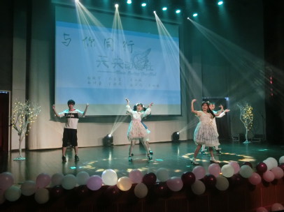 由吴璟涵、邓梦婷、李星雨、罗钧泽带来的歌舞表演《Forever young》,一出场便赢得阵阵掌声。罗钧泽同学深沉迷人的嗓音,三位女生优美的舞蹈加上有些醉人的灯光,让人不觉慢慢沉醉其中。突然灯光一闪,音乐一变,缓慢的音乐变换成动感的拉丁,场下不是传来阵阵欢呼声,女生们迷人的身姿在灯光下变换,引得大家纷纷挥舞手中的荧光棒,积极和他们互动。动感的音乐与舞蹈将现场的气氛推向高潮,台下的同学们不再像开始那样拘谨,开始积极和台上互动。