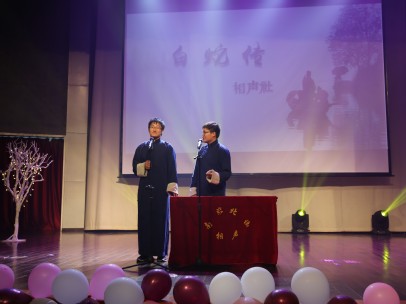 之后,灯光亮起,两位南腔北调相声社的17级学长穿着一袭长袍站在了舞台上。在一口流利的报菜名后,他们开始了独特的“白蛇传”,把《水浒传》、《红楼梦》、《桃花朵朵开》、网络用语等各种元素融入其中,将故事讲的妙趣横生,引得同学捧腹大笑。