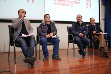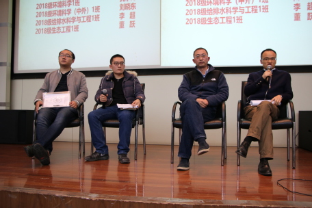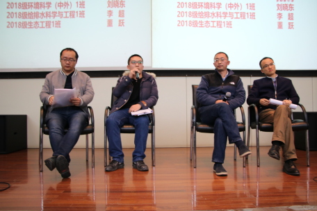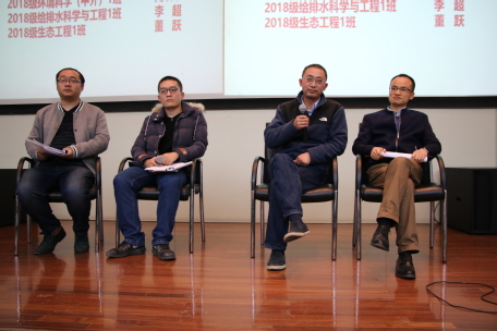 在中间的提问环节,有同学提出问题:“如果感兴趣的活动与课程冲突,该不该请假去参加活动”,刘晓东导师给出了自己的看法:可以从对自己的重要性这一方面来决策。并就如何委婉地拒绝别人给同学们一些建议。吴东海导师就同学“班级活动有个别同学不积极参与,该怎么样处理”的问题,做出了回答:可以发挥班委带头人的作用,用集体的力量来改变并带动个别同学,并与他们多交流沟通。最后一位同学向导师们提问“环境科学专业的发展方向和就业前景如何。”导师们肯定了河海大学环境专业的实力,描述了这一专业出国比例高,近年来整体素质稳步上升的情况,安抚了同学对以后发展和就业的紧张心情。