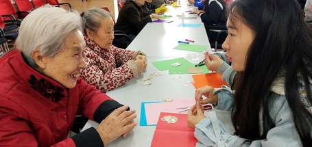 在负责人的带领下,大家摆放好了座椅和手工道具。待老人入座后,志愿者们也纷纷就座并开始和老人们一起制作手工贺卡。刚开始大家还有些生疏,但在观看了相关教学视频以及创意图片后,大家的想法便如同雨后春笋一般冒出。一些志愿者们还巧妙运用了剪纸的技巧,做出了别出心裁的贺卡。