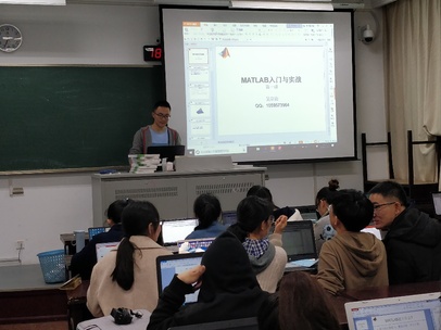 上课前,他在课件上用不同颜色的图片框框选出不同的区域并附上注释,让同学们简明的了解了每一部分的功能。之后,他又带领大家对变量的命名,简单的运算规则和数值赋值规则进行了学习,期间还通过与同学们大一学过的vb、C语言等计算机程序语言的比较来对比分析,使同学们更加容易接受新的知识。期间,同学们在他的指导下自己敲了简单的代码,命名了基础的变量。在大家基本接受了新知识后,紧接着学习比较重要的数组和矩阵的创建和访问。这部分采用知识点+例题相结合的方式,以便及时将同学们的疑惑解决掉。八点左右,吴宗志同学带领大家学习使用matlab作图,这正是这个软件的强大之处也是和细心难点。在他的带领下,大家从变量的定义,到函数的定义,基本运算,再到下达作图指令,一步步亲力亲为,做出了属于自己的“螺旋线”。