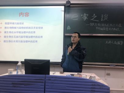 研究证明,生物作用试物质降解的主要机制,微生物在其中占据重要地位。因此,研究微生物的具体作用就显得尤为重要。赵老师说明道:“微生物个体微小,繁殖快,具有多种降解酶,代谢类型多样。”他向我们详尽的讲解了超级工程菌降解环境污染物的主要原理,并举了其应用的具体事例。如国家重大科技水专项——苏州“863”应用中,我校教授及专家们利用曝气复氧技术、化学方法、投加微生物技术、水生植物净化法及人工湿地技术,体现了我校威尼斯国际2299cc科研及应用能力的优异。在这之后,赵老师还向我们展示了几项我校教授参与的重大工程及其成果。
