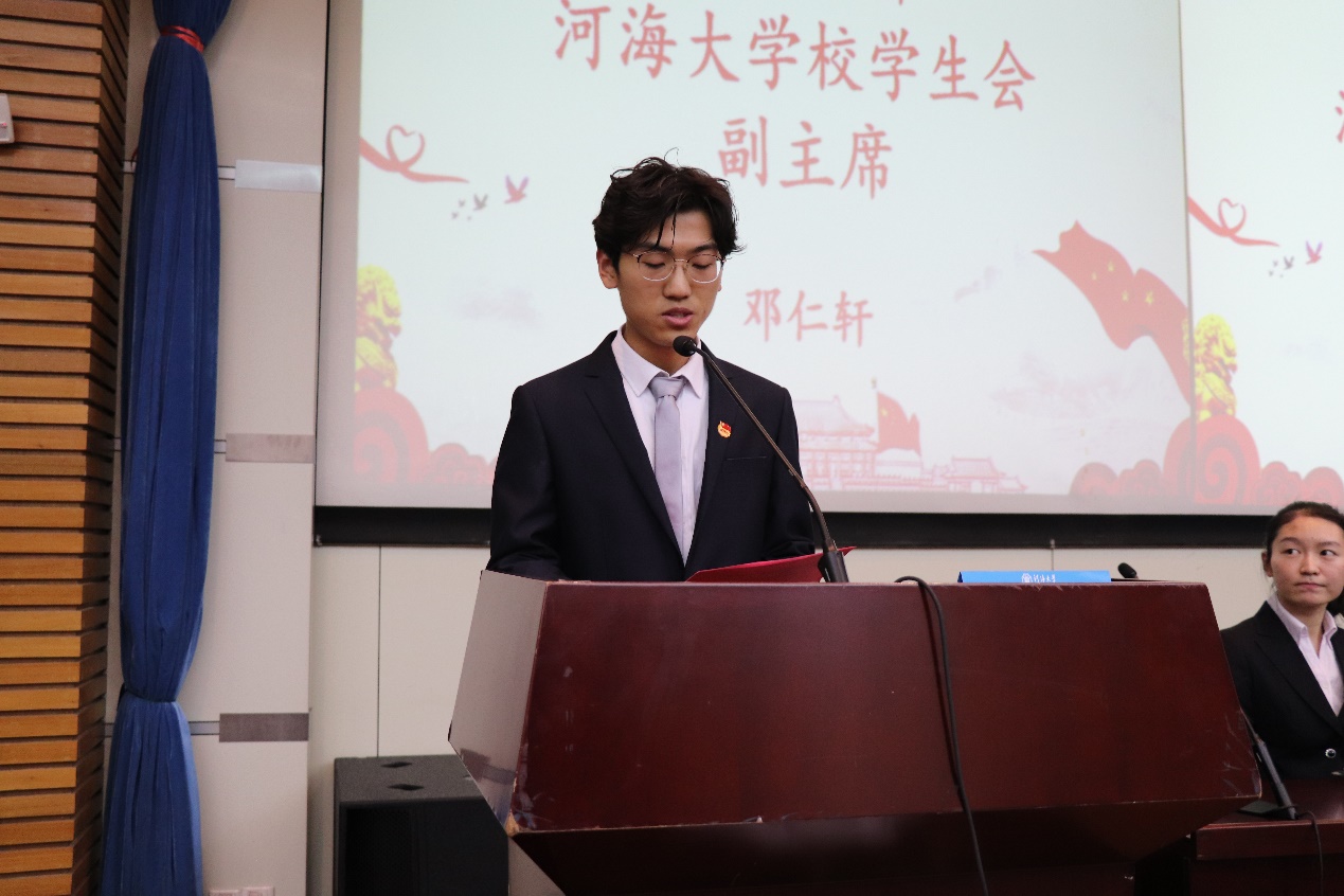 在接下来的学生代表致辞环节,校学生会常任代表邓仁轩同学和校学生科协副主席岳楠同学为开幕式致辞,他们回顾了威尼斯国际2299cc过去一年中在举办讲座、参加校运会以及其他工作中的优秀表现和取得的优异成绩,并引用习近平主席对青年一代的期盼,提出对第九届学生会和科协主席团的希望。