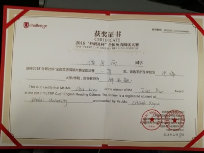 2018年12月9日,我院2015级环境科学专业本科生侯思雨同学在全国英语阅读大赛中喜获一等奖。 此项大赛由外语教学与研究出版社,教育部高等学校大学外语教学指导委员会等组织联合举办,历时3个月,由网络赛、学校落地赛、省内复赛和全国决赛组成。侯思雨同学于学校落地赛中脱颖而出,以校级特等奖晋级省赛,又力压省内其他高校选手以江苏省第一名的成绩顺利晋级全国决赛,最终在全国赛中取得一等奖的好成绩。