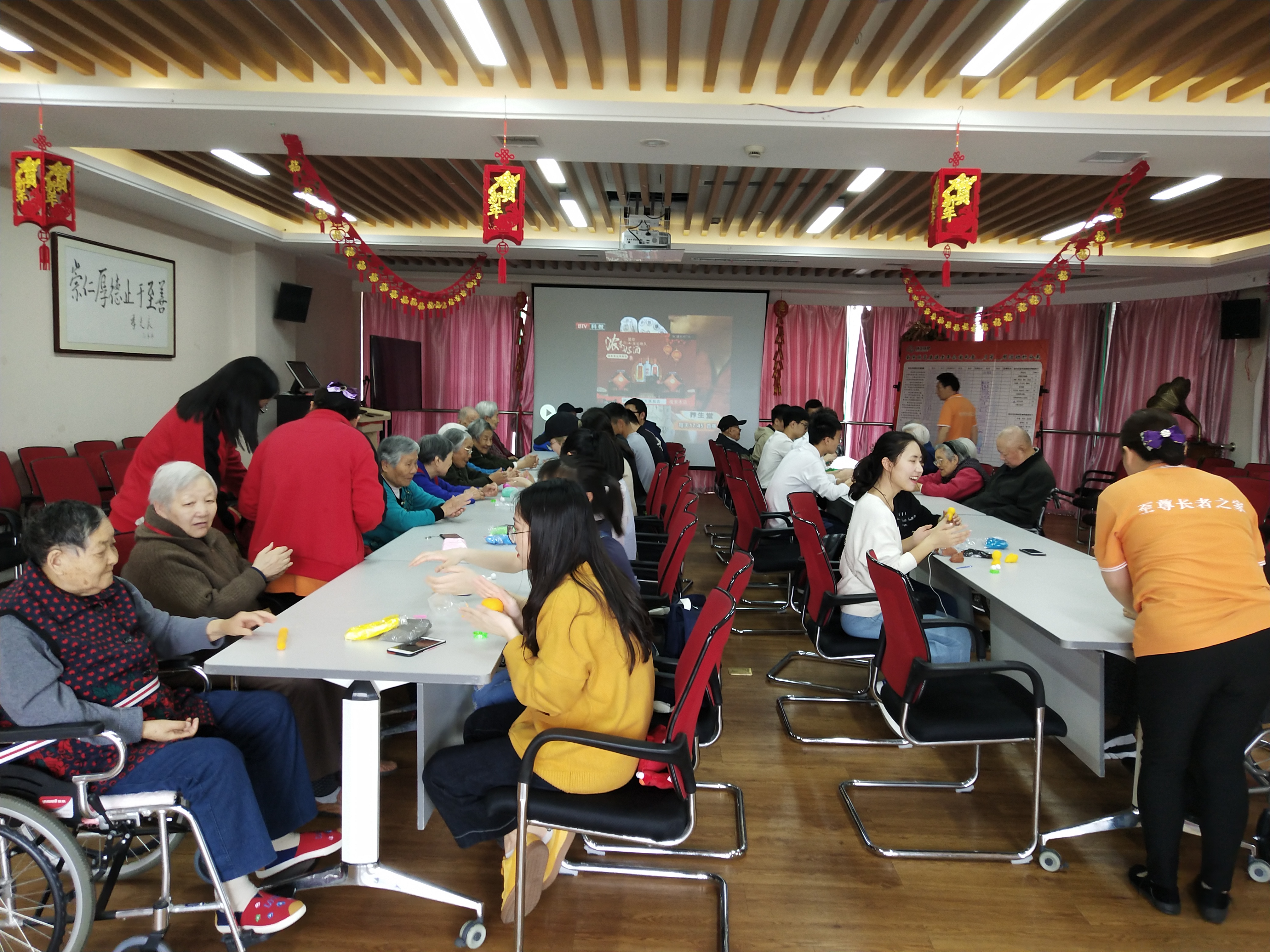 下午2点整,志愿者们在东门集结完毕,便乘车前往敬老院。志愿者们到达养老院后,便来到了坐满老人的会客厅。老人们显然都对这次活动充满期待。志愿者们将椅子搬运到长桌旁,坐下与老人们进行交流。