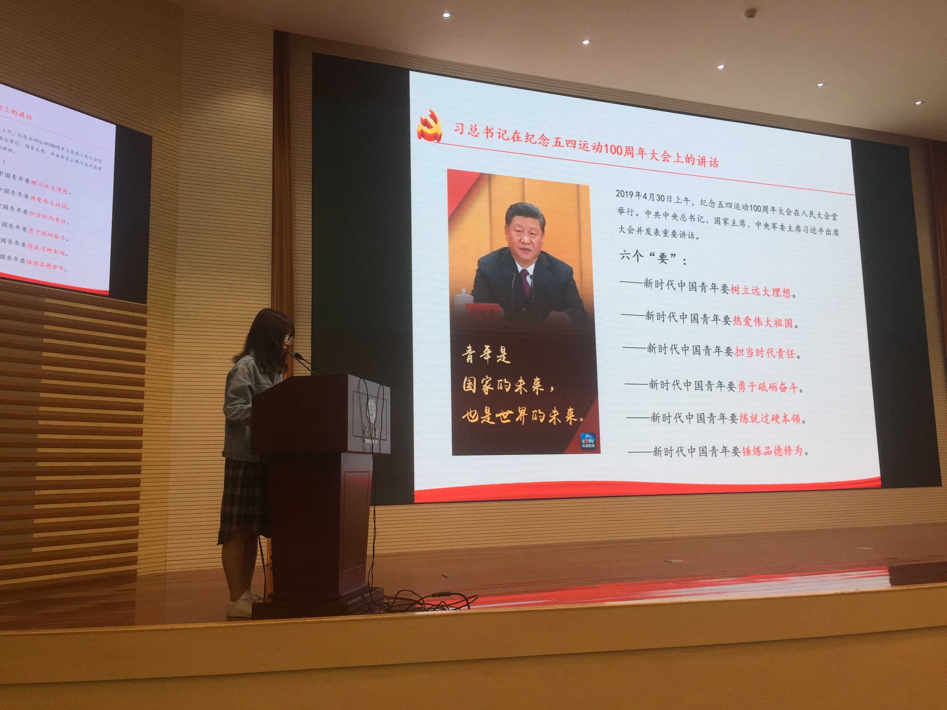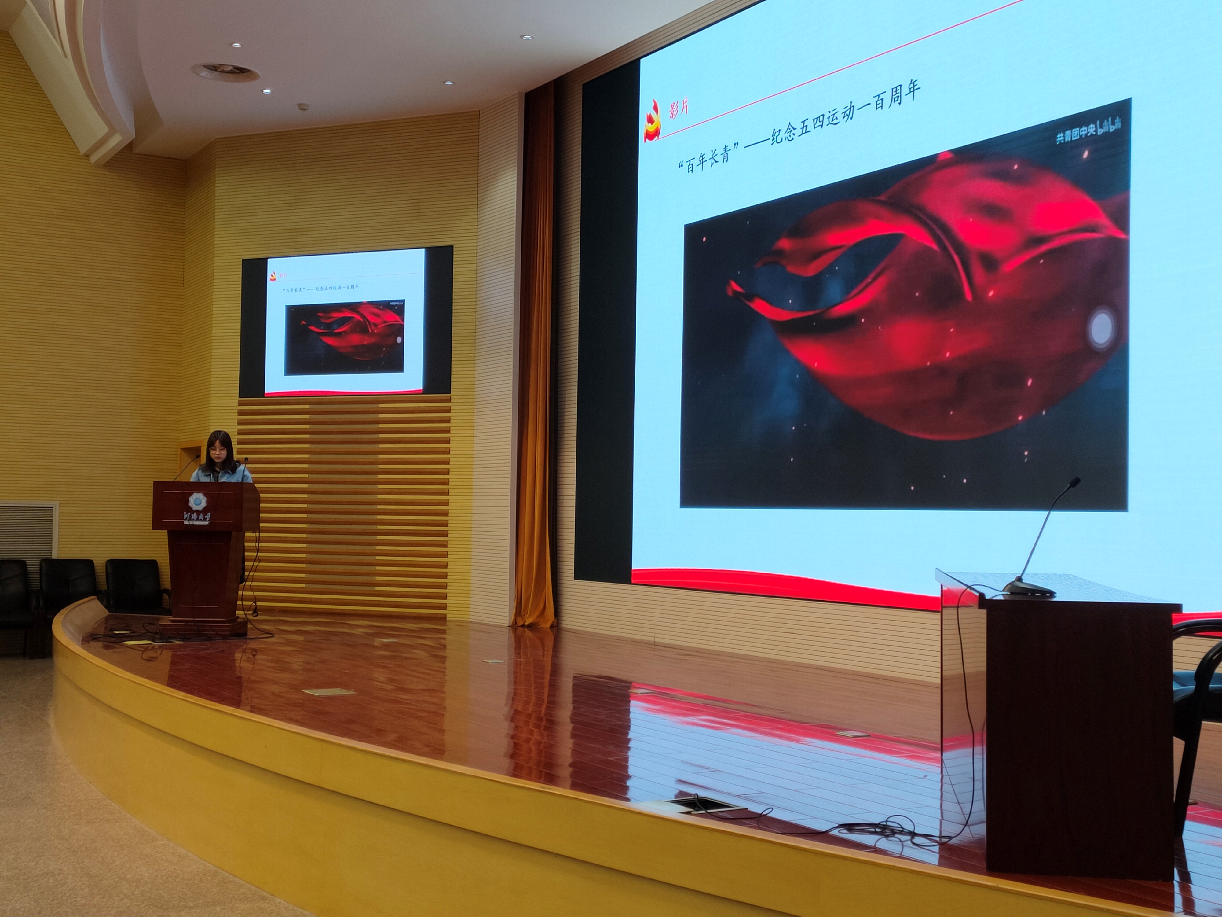 首先,李想同学播放了由共青团中央发布的“百年长青——纪念五四运动一百周年“记录短片。该短片记录了五四运动爆发以来祖国发生的重大历史变迁,展现了祖国日新月异的风貌。同学们跟随短片唤醒了历史记忆,心潮澎湃。