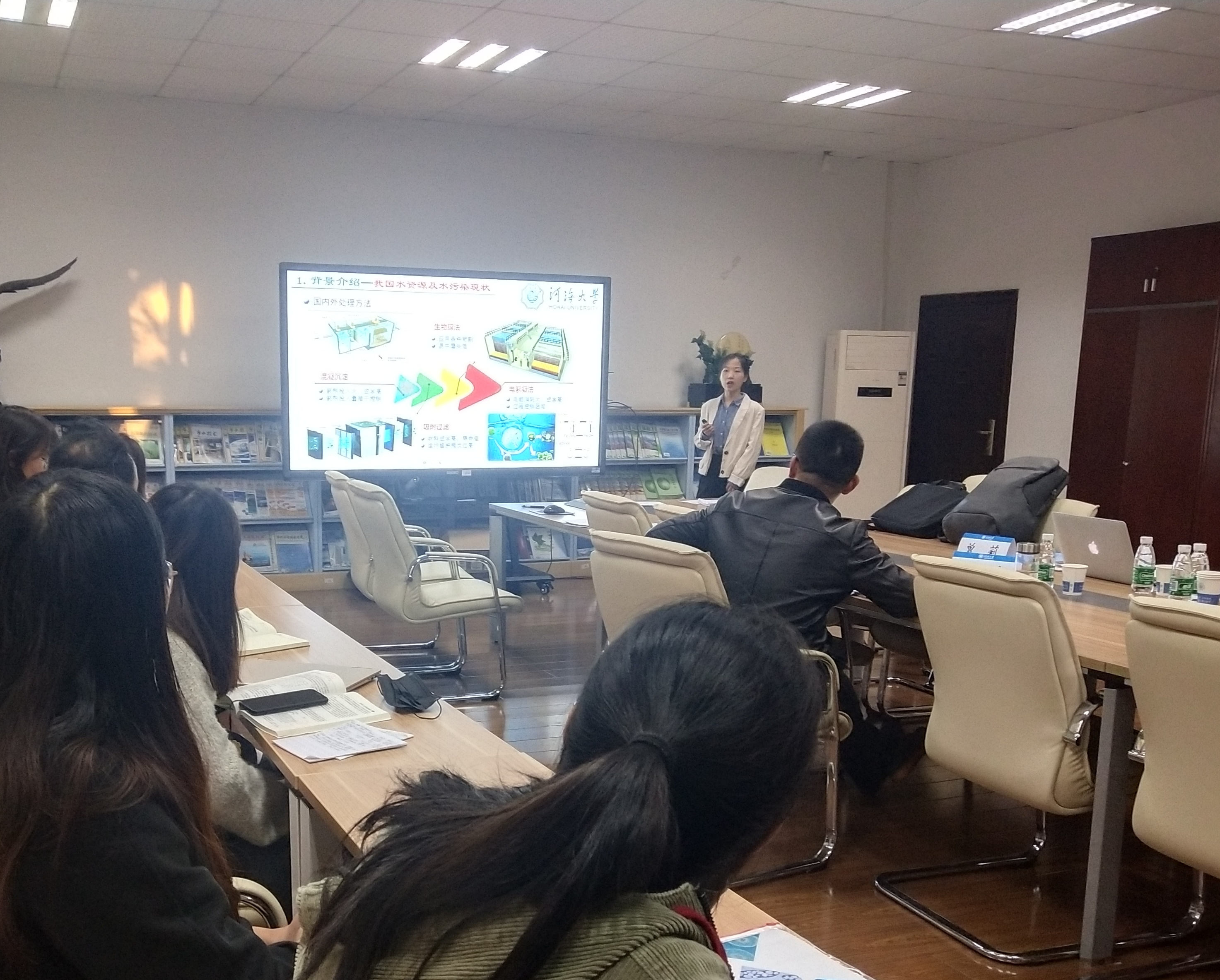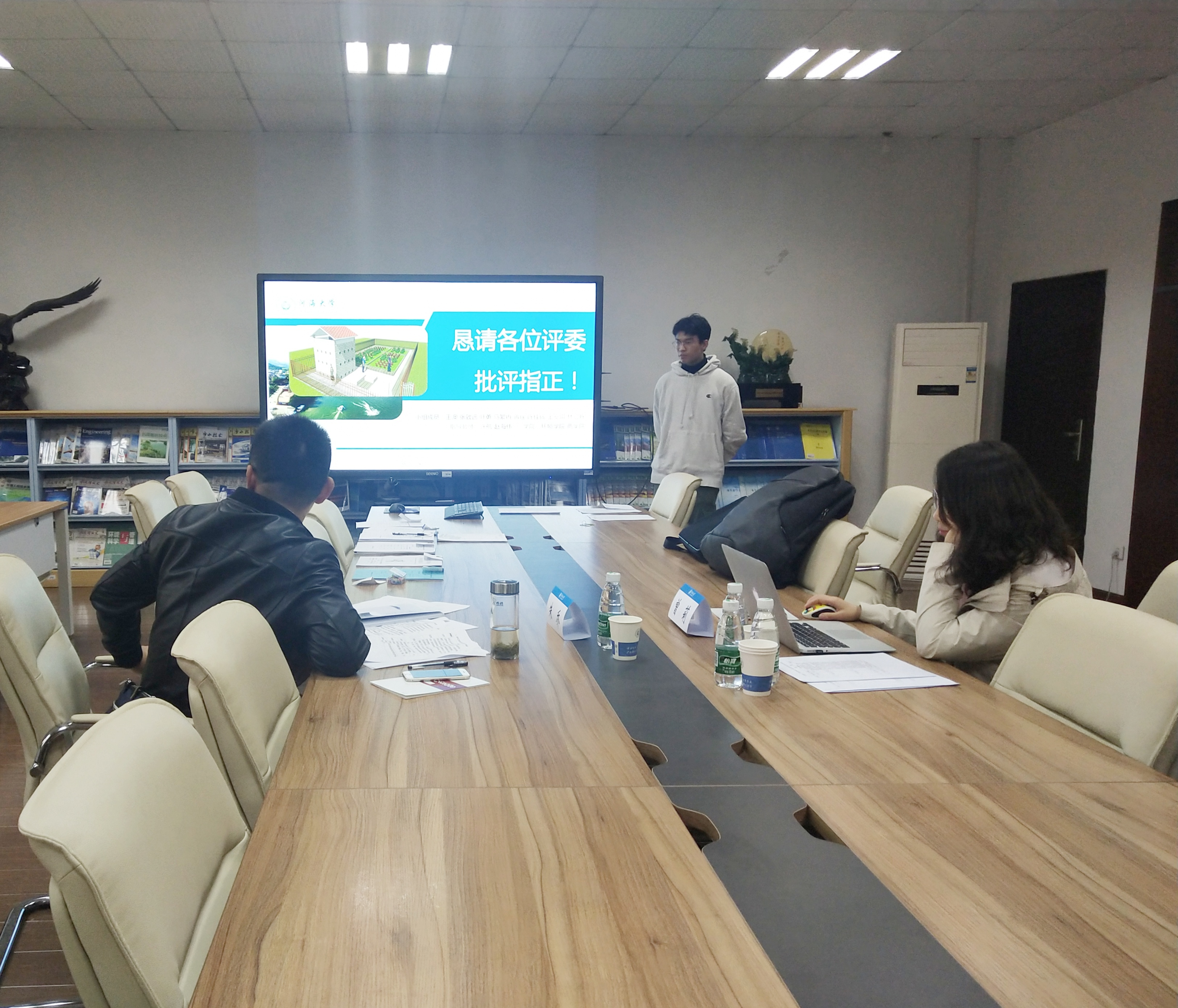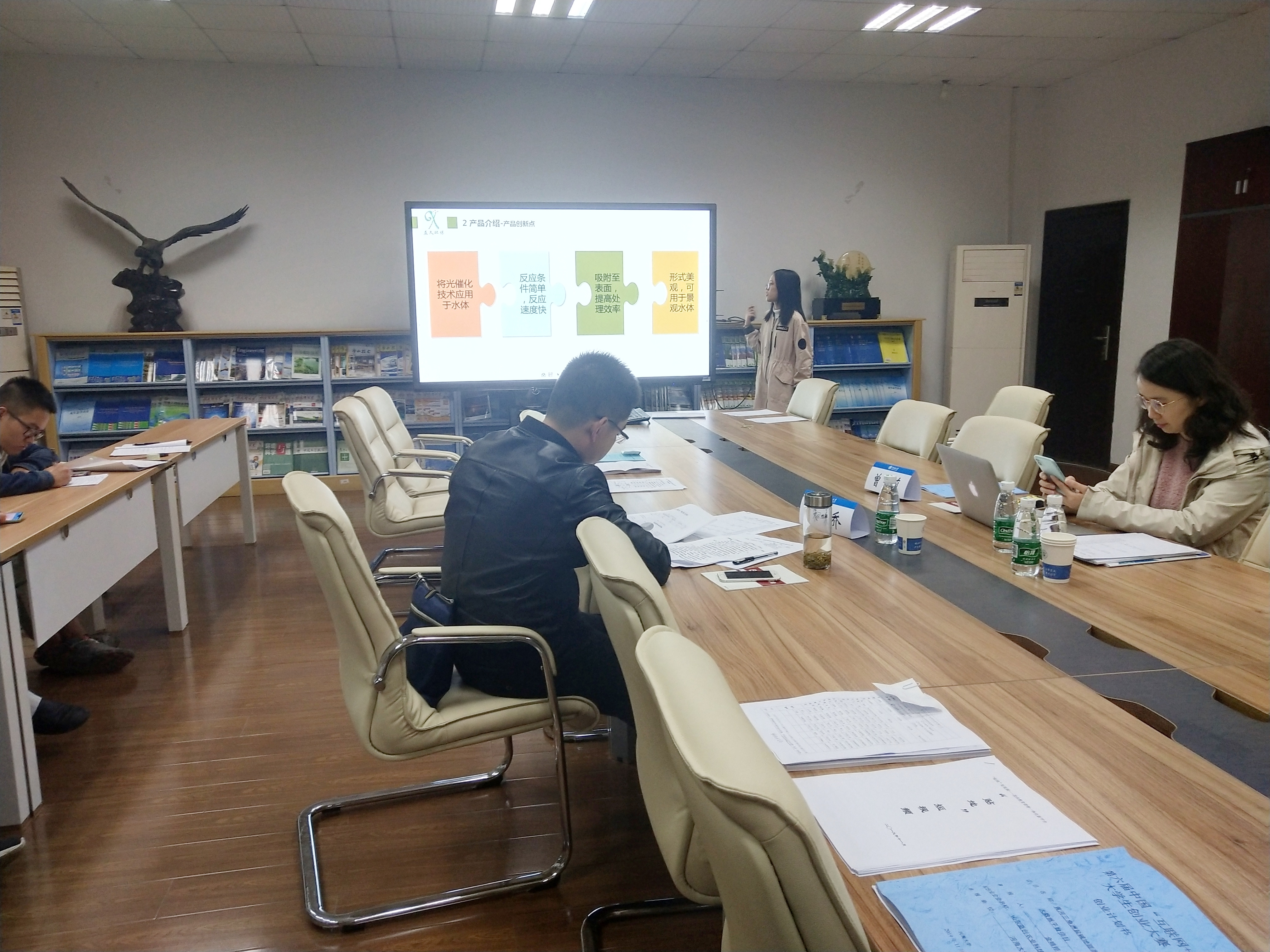 这9支队伍分别是:王澳同学负责的南京山临水环保科技有限公司团队;张磊博同学负责的新农元公益创业团队;金婧婷同学负责的山东蓝创农业科技有限公司团队;吴建宇同学负责的禹智团队;董锦云同学负责的向阳而生超越一切团队;袁炘玥同学负责的南京市益久环保材料有限公司团队;张广涵同学负责的净水“膜”法师团队;贾丽晴同学负责的南京云检达智慧科技有限公司团队;佘雨薇同学负责的建筑中水资源化小队。(以答辩顺序排序)