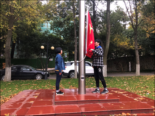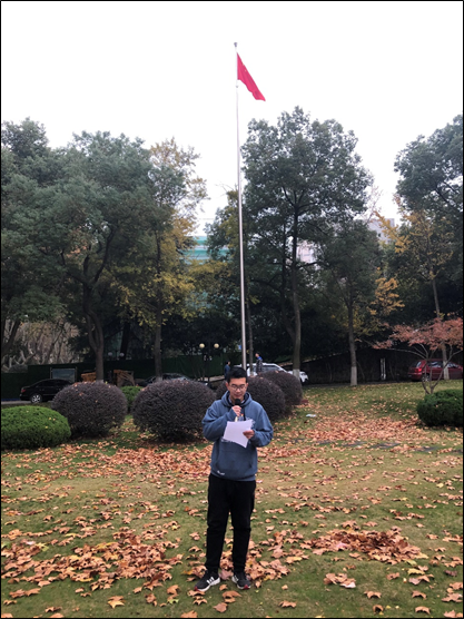 仪式第一项,升国旗,奏唱国歌,全体师生面向国旗行注目礼。此次升旗由雷晨雨和陈玲珑两位同志担任升旗手。虽然临近冬日,寒风扑面,但这冷风丝毫不减同志们的一腔爱国热情。伴随着慷慨激昂的《义勇军进行曲》,全体师生庄严地注视着国旗,高唱国歌,表达对祖国崇高的敬意。