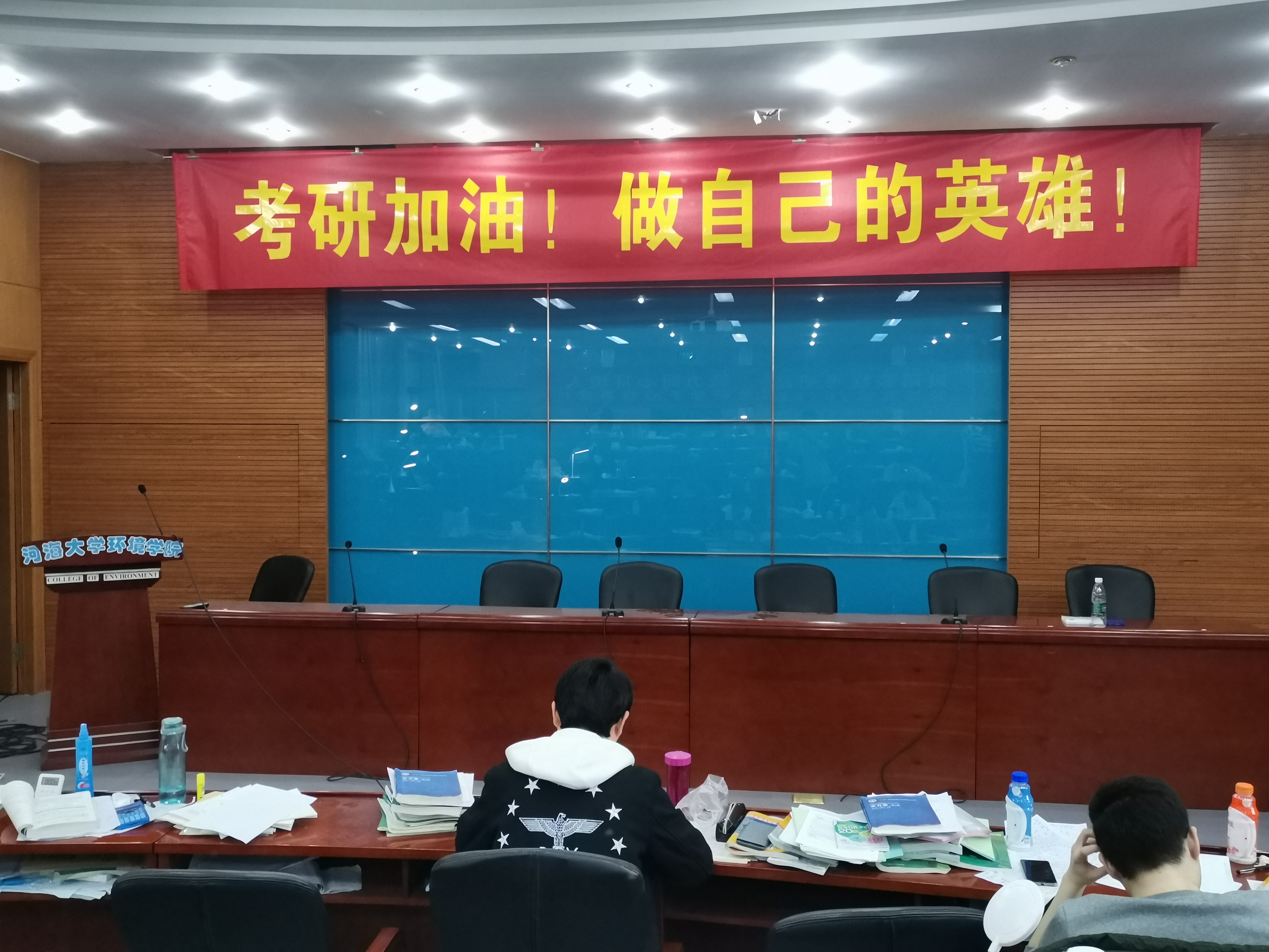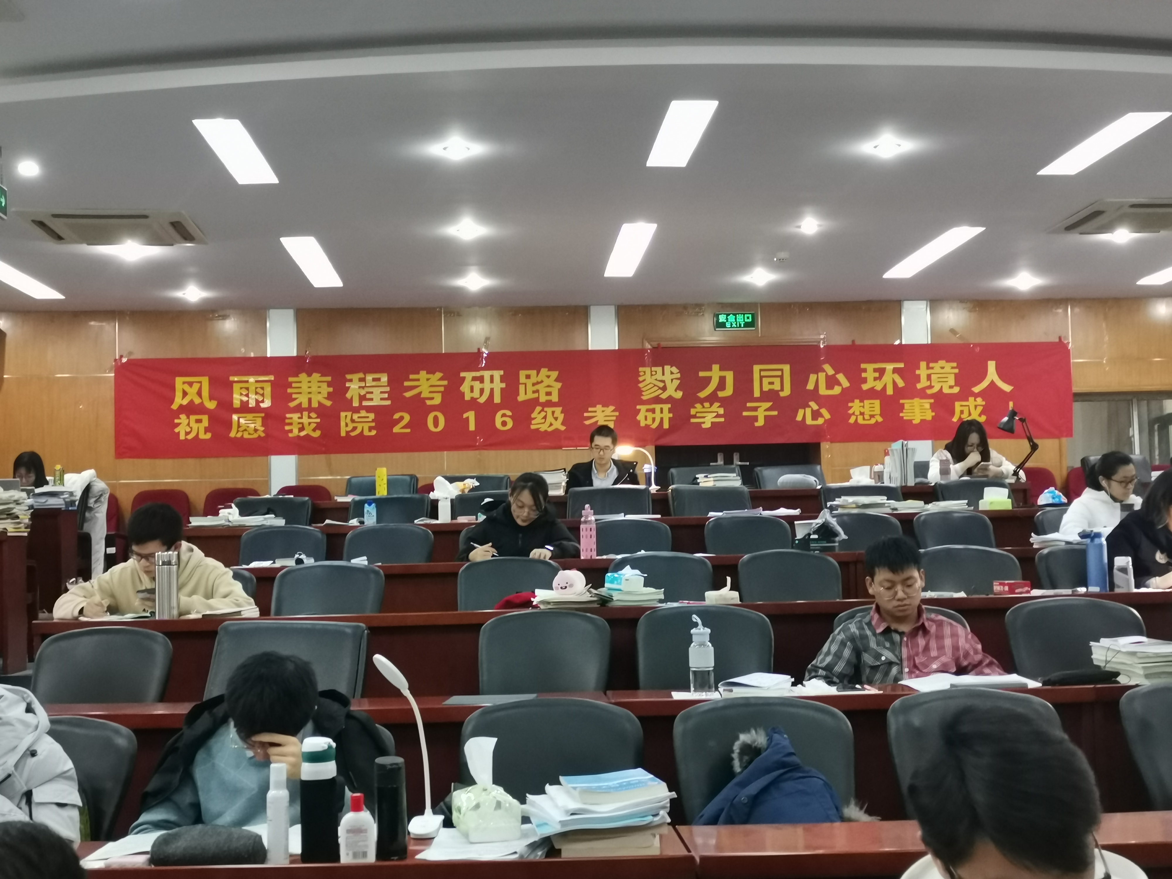 除此之外,为了让同学们能以更好的状态准备考研,威尼斯国际2299cc给予了十足的关怀。在学习方面,学院特地向学校申请了水利馆301的会议室作为威尼斯国际2299cc同学们的专用考研复习教室,给同学们提供了一个固定而温暖的学习空间,为同学的复习生活提供了极大的便利。在生活方面,学院在快要来临之际举办了考研动员大会,鼓舞考研同学的士气,缓解大家的紧张与压力,让同学尽量以最佳的心态复习应试,同时也为学生的复习计划提供了参考经验。学院还精心订制了条幅展示于考研复习教室的前后,让大家在学习之余能够感受到学院老师和同学们的鼓励,希望同学能够心想事成、不负青春、做自己的英雄!