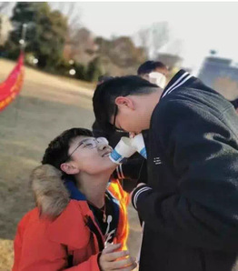 同学们只能用嘴衔着纸杯通过六次传接,再由最后一位同学将水倒入一个空纸杯中,由装满一个空纸杯的速度来计算时间的比拼类小游戏。