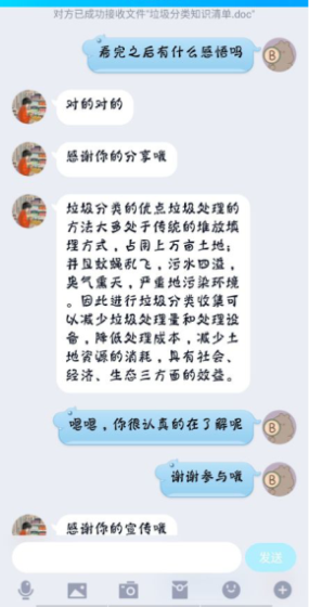 此次活动有近两百位同学参与,他们利用自己的课余时间在线上宣传垃圾分类的知识、意义和方法。此次活动不仅让更多的民众意识到了垃圾分类的重要性以及详细了解了如何正确地去进行垃圾分类为我国垃圾分类的进步尽了一份力,也提升了参与同学的人际交往能力和沟通能力,帮助他们结识了更多的朋友。