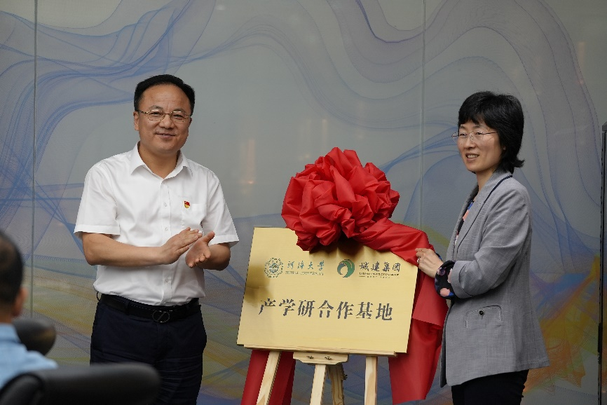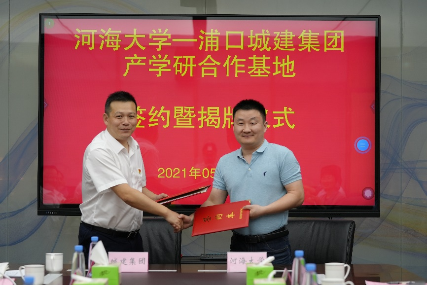 交流结束后,王沛芳院长与浦口城建集团党委书记、总经理周进达代表双方为产学研合作基地揭牌,林涛副院长与浦口城建集团党委副书记、副总经理江明镜签署双方合作协议。科技处副处长孙林、学院相关研究方向教授参加了产学研合作基地的签约揭牌仪式。