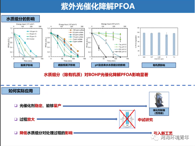王教授进而提出了本次E家之谈的主要技术:光催化水处理技术。其中重点讨论了紫外光催化降解PFOA,并分析了其实际应用中相较于其他技术的优点:过程稳定,能大范围应用,过程清晰,降低了水质组分对处理过程的影响。其反应机理为以空穴为主要氧化剂的直接氧化反应,超氧自由基和羟基自由基为辅,其中,吸附性强弱决定了降解速率。