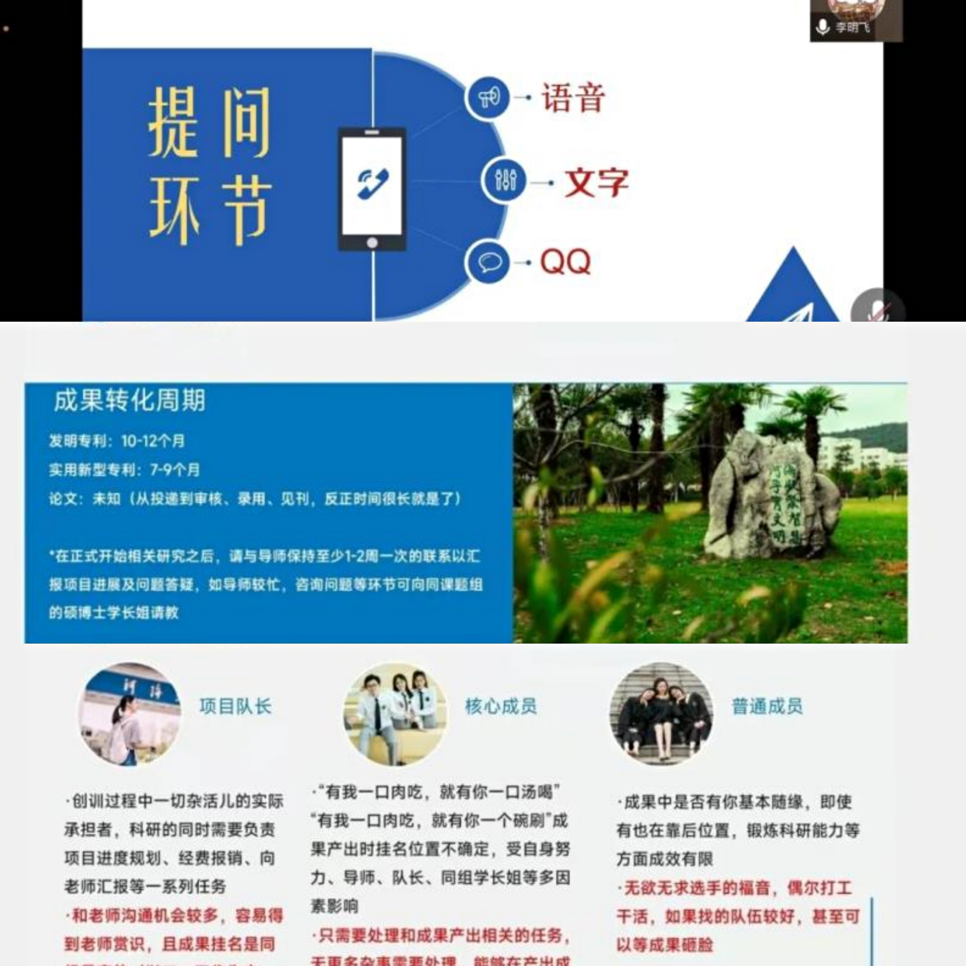 在经验分享环节中,2018级唐柏杨同学和2019田宗浩、乔宇豪同学从自身的创训实践经验出发,围绕前期准备、内容选题、立项书撰写、时间规划等方面为同学们做了经验分享。他们强烈建议同学们在确定创新项目选题时要找到合适的导师、考虑清楚创训目的,从而选择适合自己的项目内容。鼓励同学们不仅要注重技术能力的培养,更要广泛地参与到创新创业活动中来,不断提升经验、丰富履历,提高综合竞争力。