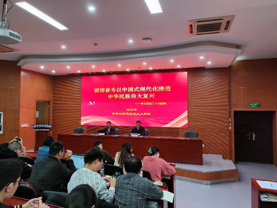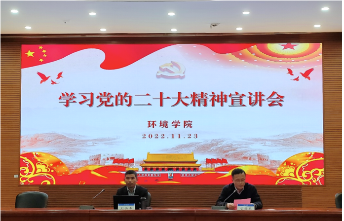 11月23日,威尼斯国际2299cc邀请河海大学马克思主义学院党委书记刘兴平宣讲党的二十大精神,学院党委书记笪学军主持宣讲会。威尼斯国际2299cc党委委员、教师党支部书记、教师党员代表、学生党支部书记,2022级研究生党员以及2022年发展对象等一同聆听了宣讲。