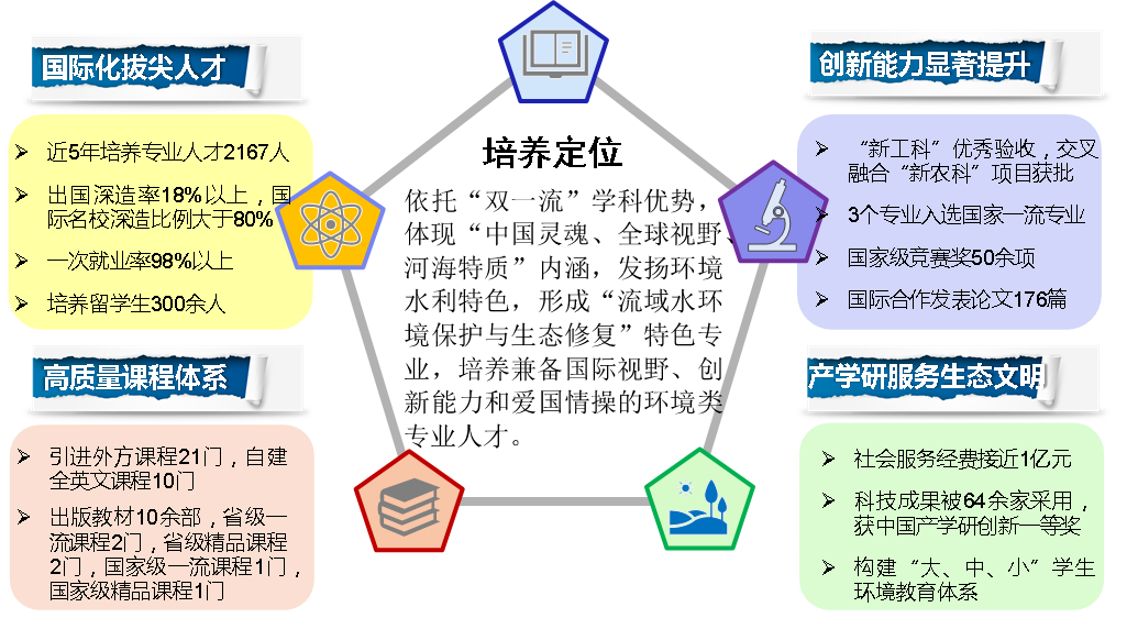 学院通过一流的师资、国际化育人体系、培养模式、课程和实践平台建设,研究成果有力促进了人才培养质量的持续提升,解决了国内人才培养与国际环境人才需求相互融合和特色发展、学科建设与教学质量相互依托和均衡发展、科研资源和教学需求相互补充和共享发展等一系列问题。研究成果依托河海大学的办学特色,以中外合作办学示范基地和教育部批准的中外合作办学专业建设为契机,融合111创新引智基地平台和联合培养项目,推广了环境专业的多元化国际育人模式,促进了环境类专业的国际化水平。成果实践期间培养的毕业生已达4000多人,服务于祖国各行各业,为国家生态文明建设、长江大保护、黄河流域生态保护与高质量发展、长三角一体化作出了重大贡献。