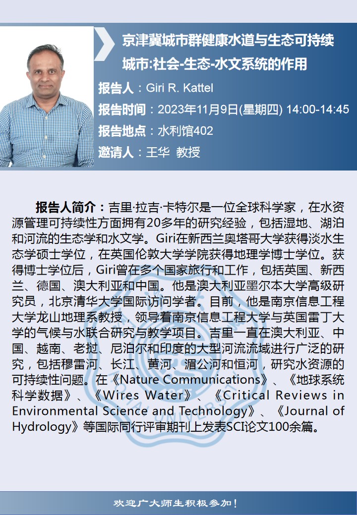学院学术报告:京津冀城市群健康水道与生态可持续城市:社会-生态-水文系统的作用
